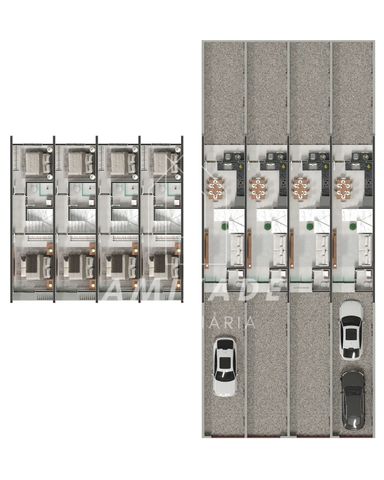 A casa possui um total de 65 m² de área construída, sendo dois dormitórios, sala, cozinha, lavabo, banheiro e uma vaga para garagem. Com acabamento em piso retificado e gesso na parte térrea.